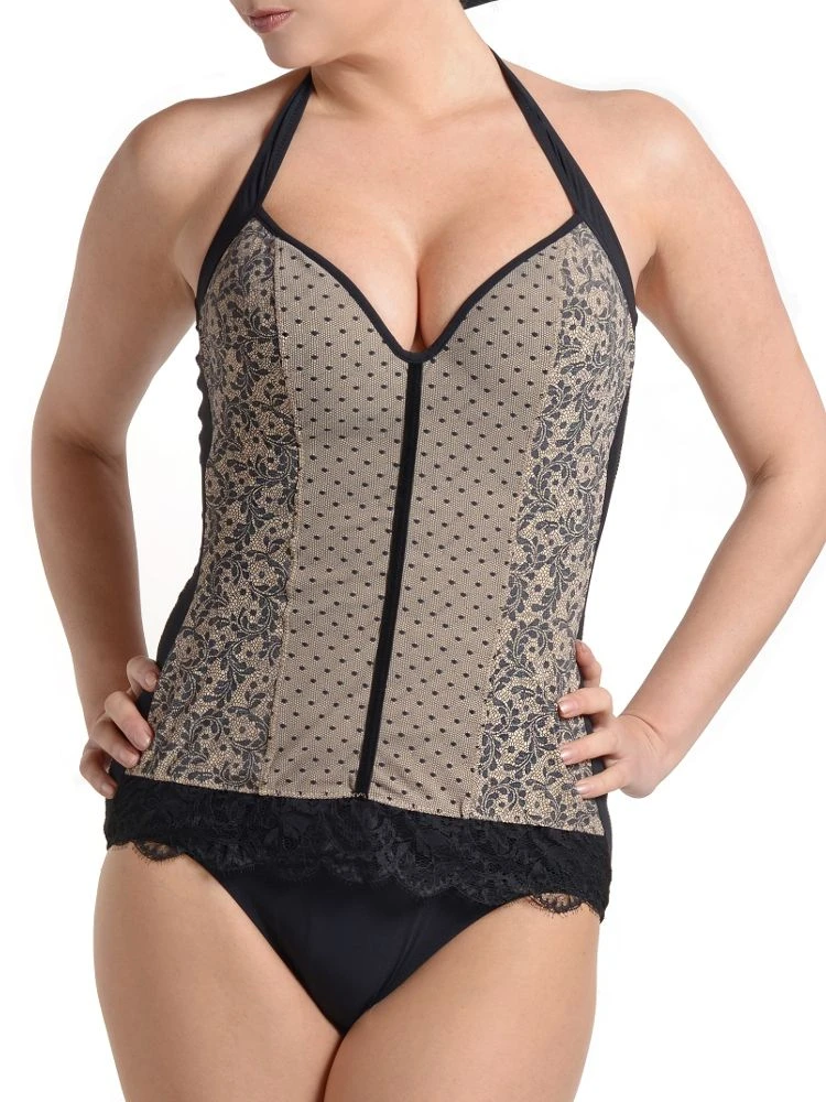Der Badeanzug ist aus weichem Feinjersey gearbeitet und im vorderen Teil komplett doppellagig. Vorne unten ist er etwas überlappend und mit einem Saum aus echter schwarzer Spitze gestaltet – hierdurch entsteht der Eindruck eines Tankinis, was den Badeanzug angenehm figur-kaschierend macht und die Beinausschnitte oben etwas abdeckt ohne einzuengen. Er ist mit B- Cup ausgestattet. Dieser Badeanzug ist in den Größen 36 bis 46 (deutsche Damengrößen) und in der Farbe nude mit schwarz erhältlich.