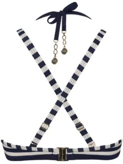 Dieser Marlies Dekkers Push Up Bikini ist aus der modischen Bademode-Kollektion von Marlies Dekkers und nicht nachbestellbar. Die Serie Maritime Blue ist in der Farbe dunkelblau, creme gestreift mit gold erhältlich. Es gibt diesen Bikini mit B bis C- Cup in den deutschen Damengrößen 70 bis 80.