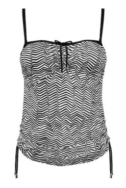 Die besondere Wirkung dieser modern inszenierten Zick-Zack-Grafik beruht auf dem Zusammenspiel von pulsierender Wellenbewegung in Schwarz-Weià und sportlichen Elementen. Die Kontraste der edlen Serie Black Bites werden durch die schwarze Umrahmung und FarbflÀchen ergÀnzt und erzeugen bei unserem Tankini-Oberteil einen vorteilhaften Effekt.
